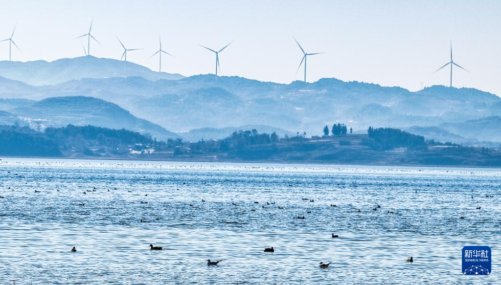 12月12日在贵州草海国家级自然保护区拍摄的越冬候鸟(无人机照片)。冬季,贵州草海国家级自然保护区栖息着大量越冬候鸟。成群的候鸟或在水中嬉戏、觅食,或升空,呈现出一幅冬季生态图景。新华社记者 陶亮 摄