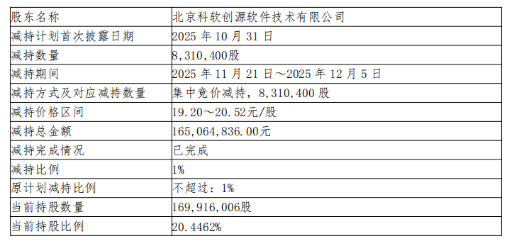 中国经济网北京12月8日电 中国科技软件(603927.sh)近日披露股东减持结果称,截至公告日,公司股东北京科软创源持有169,916股,约占公司总股本的20.4462%。 2025年12月5日,公司收到股东科软创源发出的《减持股份结果通知函》。至2025年12月5日,科软创源减持计划已完成。 2025年11月21日至2025年12月5日,科软创源共减持公司股份831.04万股,占公司总股本的1%。所有削减均通过集中竞价交易进行。本次减持价格区间为19.20元至20.52元/股,减持总额为165,064,836.00元。中国科标科技2024年年报显示,科标创源为公司控股股东。